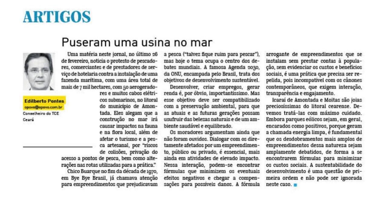 Artigo “Puseram uma usina no mar” do presidente do IRB Edilberto Pontes (TCE-CE) 5 de março de 2022 Por ascom.cnptc