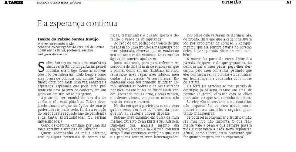 Leia o artigo “E a esperança continua” do conselheiro Inaldo da Paixão (TCE-BA) 20 de maio de 2021 Por ascom.cnptc