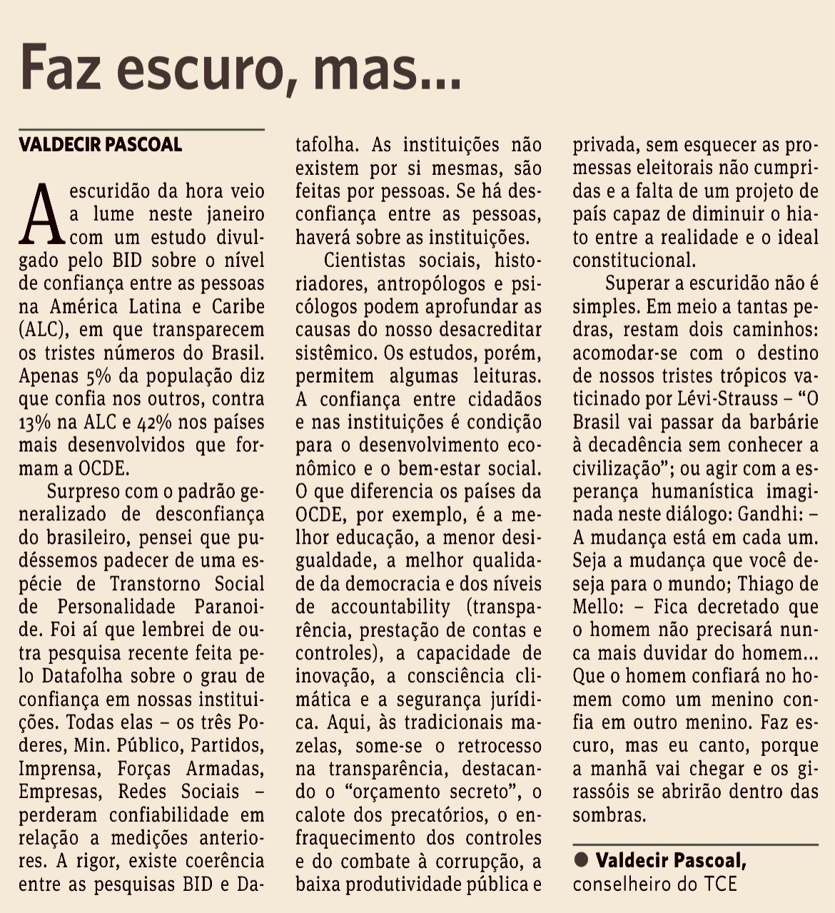 “Faz escuro, mas…” artigo do conselheiro Valdecir Pascoal (TCE-PE) 23 de janeiro de 2022 Por ascom.cnptc