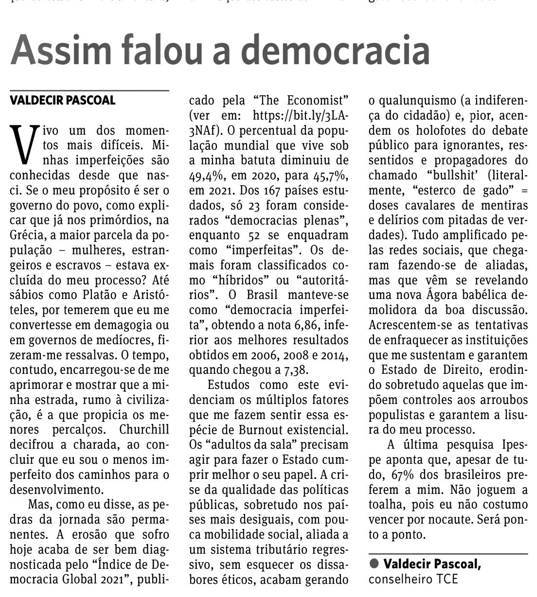 Leia o artigo “Assim falou a democracia” do conselheiro Valdecir Pascoal (TCE-PE) 20 de fevereiro de 2022 Por ascom.cnptc
